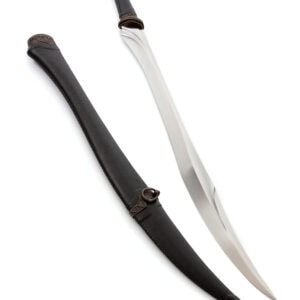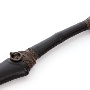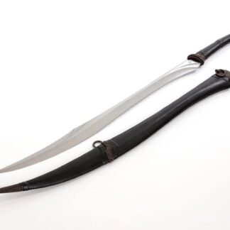 Every item we produce is handmade and unique, even our Limited Editions. The 80CrV2 high carbon spring steel blade is ground from 5/16th” stock (7.5mm). Blades are fully hardened and tempered to a Rockwell hardness of 54-56RC. The scabbard is leather-bound ash.