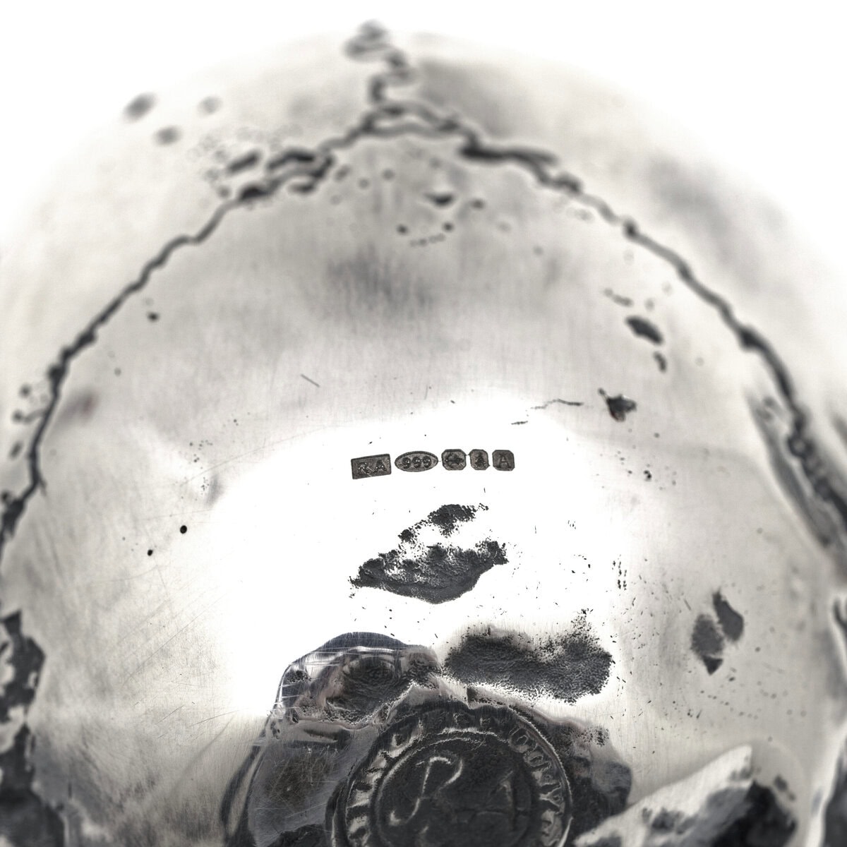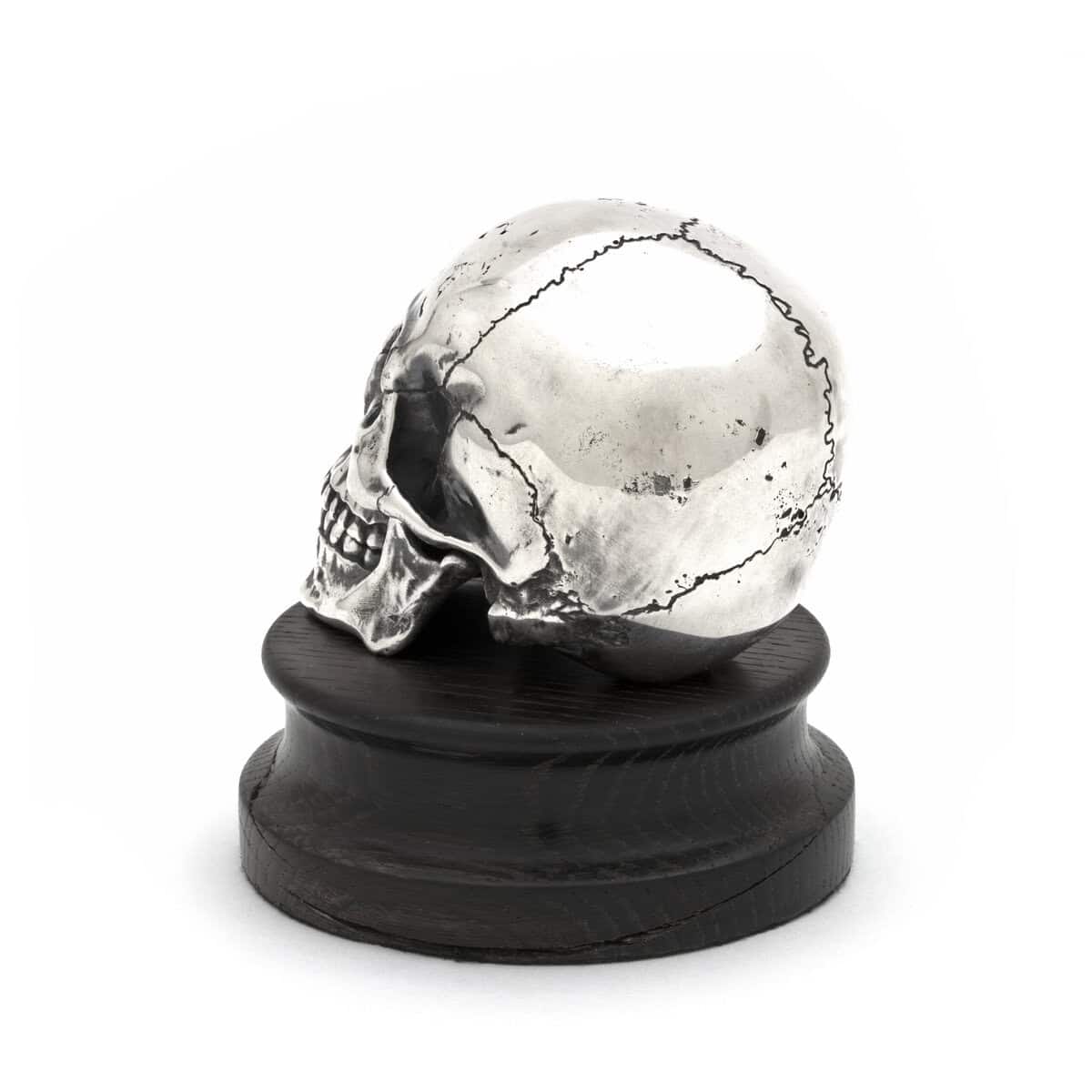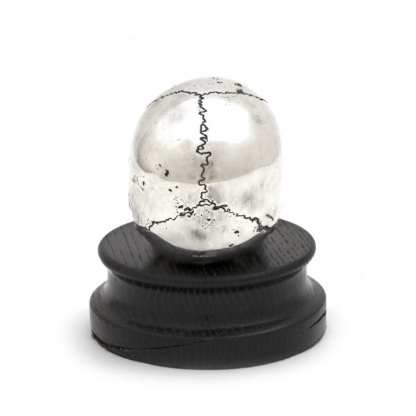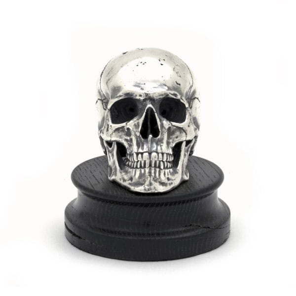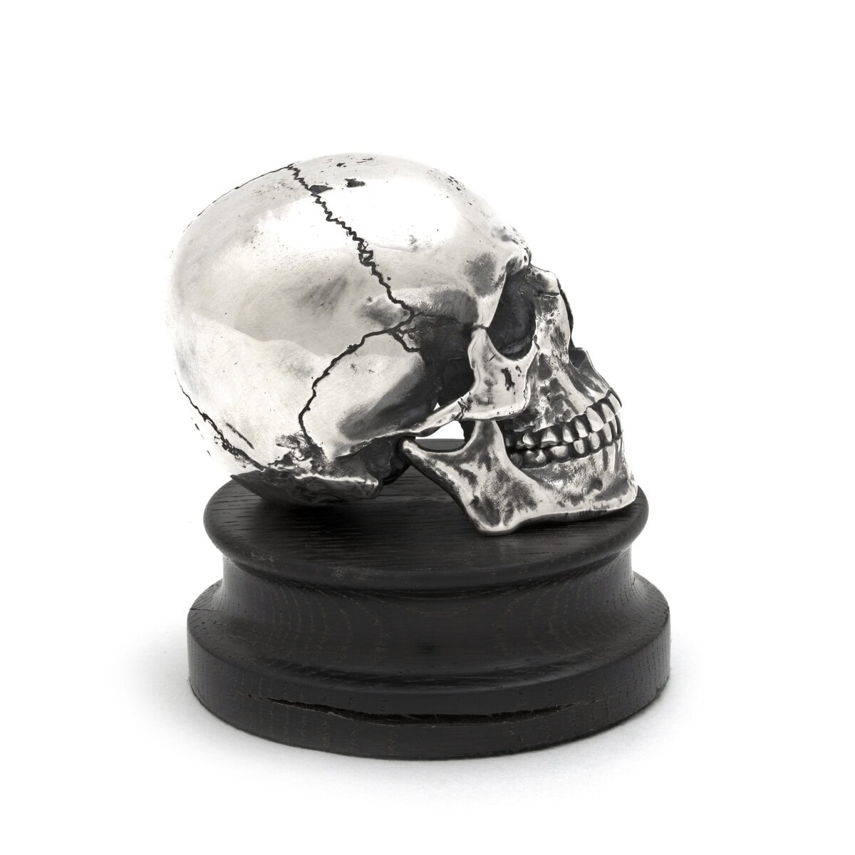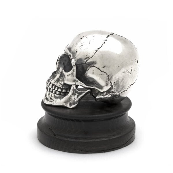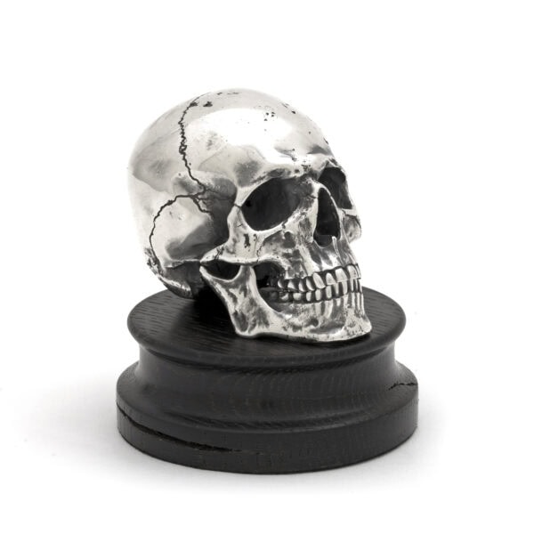 Totally hand-made in wax and lost-wax cast. Each skull is unique, scaled down from a real human skull with exceptional anatomical accuracy and detail. As with our full sized skulls, we have made a small pair of sculpted sockets to lock the mandible (lower jaw) to the skull – the sockets are inconspicuous and allow the jaw to be fixed to the skull yet still articulate. After casting the skull has been carefully finished by hand before being darkened, painstakingly polished and then Hallmarked. We have made very few of these one third sized skulls in fine silver.