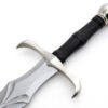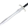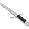 This sword has a broad blade in 80CrV2 with a pair of flutes just below the ricasso. The handle material is english ash, which has been bound in black calfskin with a wrap and stitch bind. Equipped with stainless steel fittings, the weight is 2lb and 11oz (1.22kg). The guard is 16cm wide (6 5/16″) with the grip length being 12cm (4 3/4″).