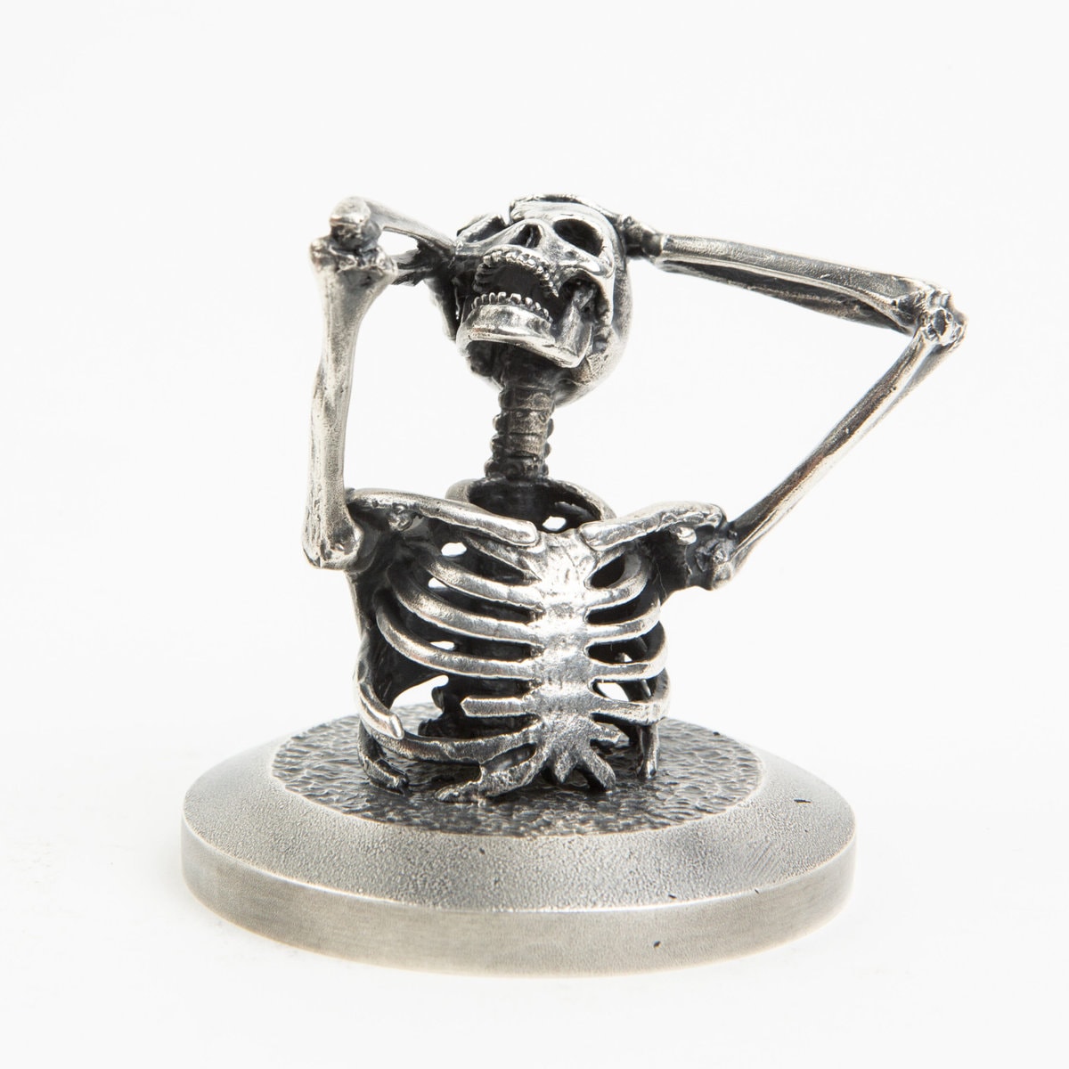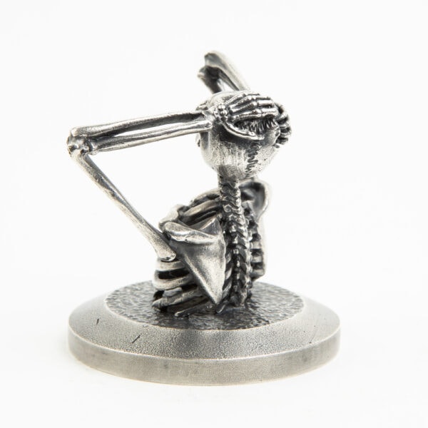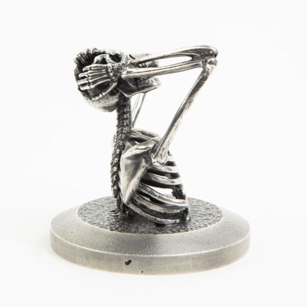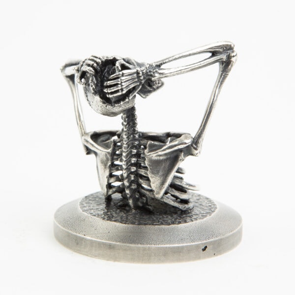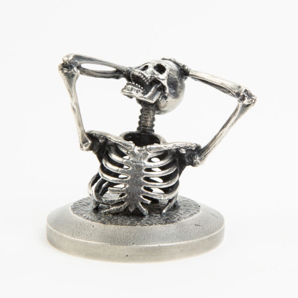 A miniature Skeleton tearing his head open. Each miniature skeleton sculpture is unique, individually handmade bone by bone in wax then lost-wax cast into bronze.This sculpture is being produced in two, numbered, limited editions.