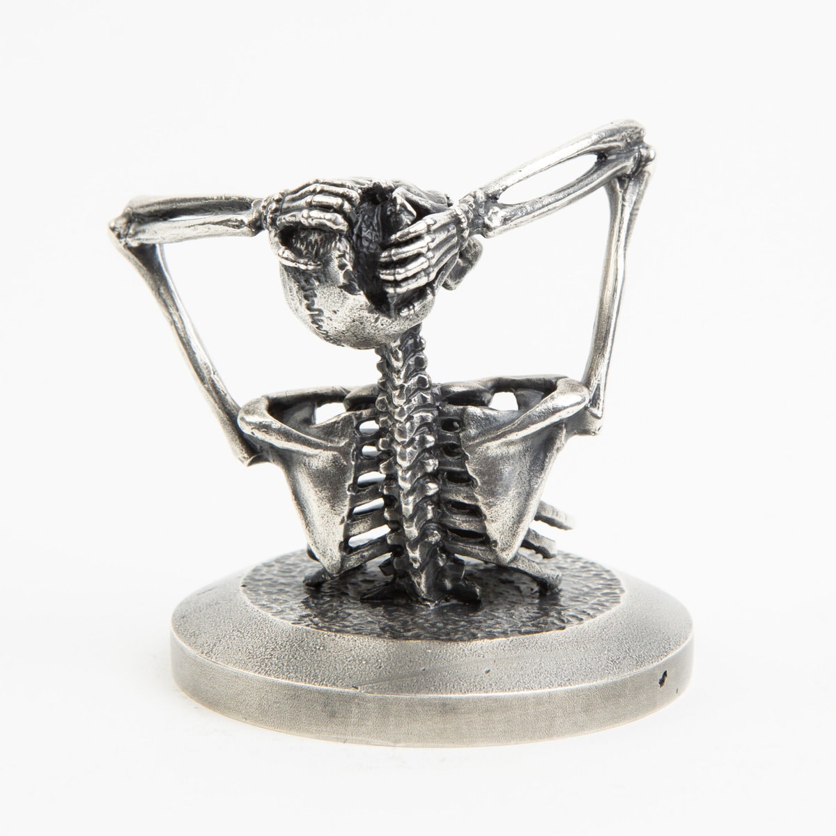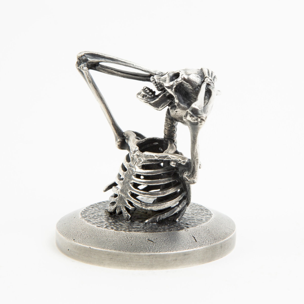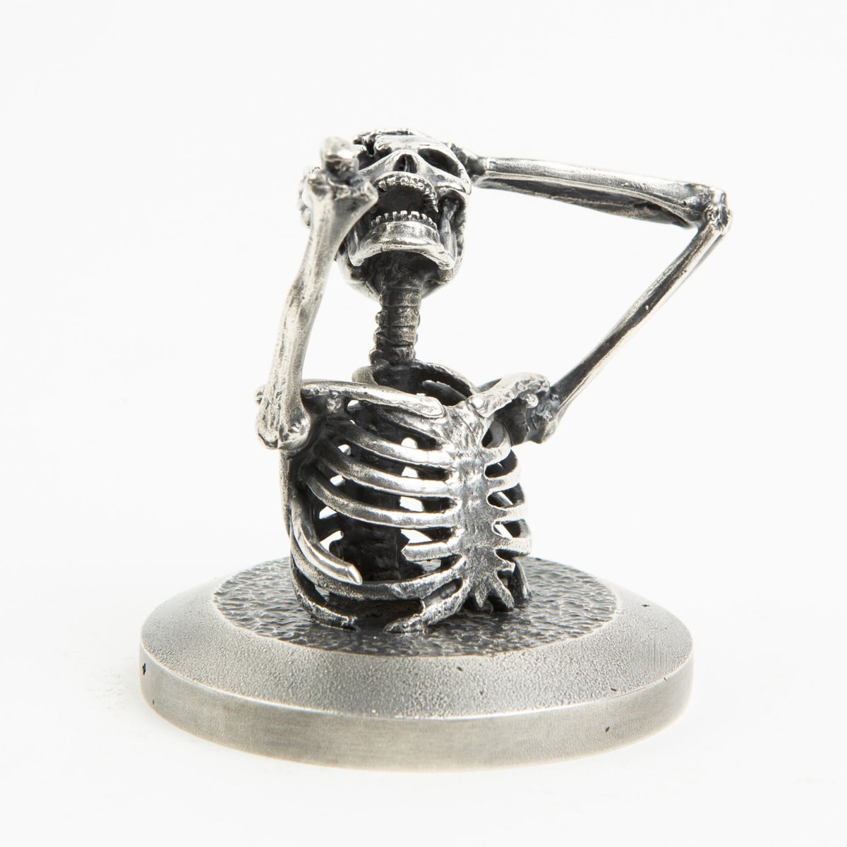 A miniature Skeleton tearing his head open. Each miniature skeleton sculpture is unique, individually handmade bone by bone in wax then lost-wax cast into bronze.This sculpture is being produced in two, numbered, limited editions.