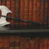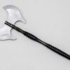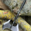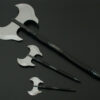 The one third size Snaga is produced with a turned spring steel handle. The grips are bound with calfskin. The runic inscription “Sender The Blades Of No Return” is engraved into four panels around the handle and inlaid in silver. It is an exact scaled one third size miniature reproduction of the Legendary Axe.