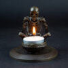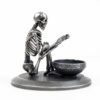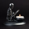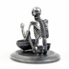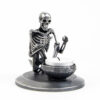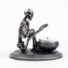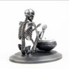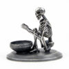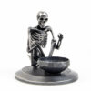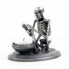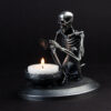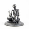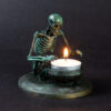 A skeleton warming his hands on the flame of a nightlight. Each miniature skeleton sculpture is unique, individually handmade bone by bone in wax then lost-wax cast into bronze.